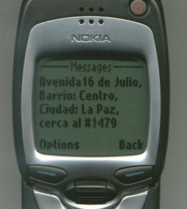 Cómo evaluar? Mediante de un teléfono celular de cualquier operador en Bolivia, envíe el siguiente mensaje de texto: 22.TEST.[Nombre de Usuario].[Contraseña] (para el vehículo de prueba con conexión SMS) o 22.GPRS01.[Nombre de Usuario].[Contraseña] (para el vehículo de prueba con conexión GPRS) al número 72098120 que es el número telefónico de nuestro Servidor de Consultas de Localización Satelital para Evaluación (el Servicio Celular de Evaluación recibe mensajes desde celulares TDMA o GSM de Móvil de Entel, Viva y Telecel.) donde 22 es el comando, 000XXX o GPRS01 son las placas de control de los Vehículos de Prueba, [Nombre de Usuario] y [Contraseña] son los datos que le proporcionaremos para que realice las pruebas (al final de esta página encontrará cómo requerir esta información). La evaluación es gratuita, usted solo pagará a su operador de telefonía celular, el valor del envio de un mensaje de texto normal. Ejemplo Suponga que le dimos la siguiente información: [Nombre de Usuario] = test [Contraseña] = test Usted deberá enviar el siguiente mensaje: 22.TEST.TEST.TEST (para localizar el vehículo de prueba con conexión SMS) o 22.GPRS01.TEST.TEST (para localizar el vehículo de prueba con conexión GPRS)